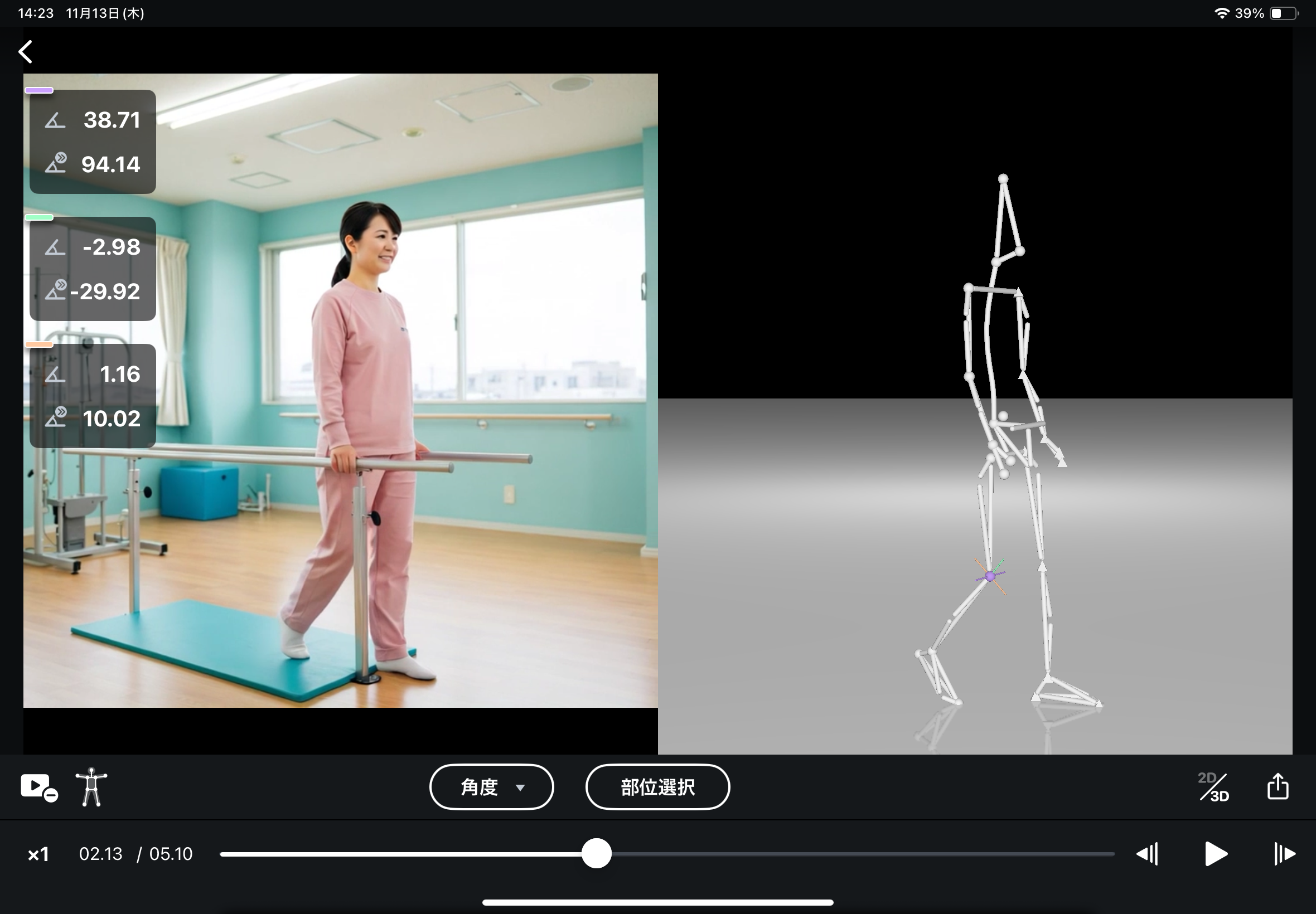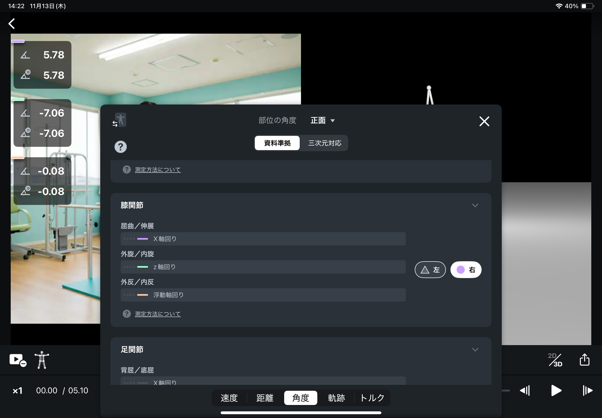 三次元的な動きを加味した3軸の角度が表示されるようになりました。これまでマーカーレスでは難しかった「内旋・外旋」や、足関節の「外反・内反」といった角度計測にも対応し、より深く、専門的な分析が手軽に行えます。