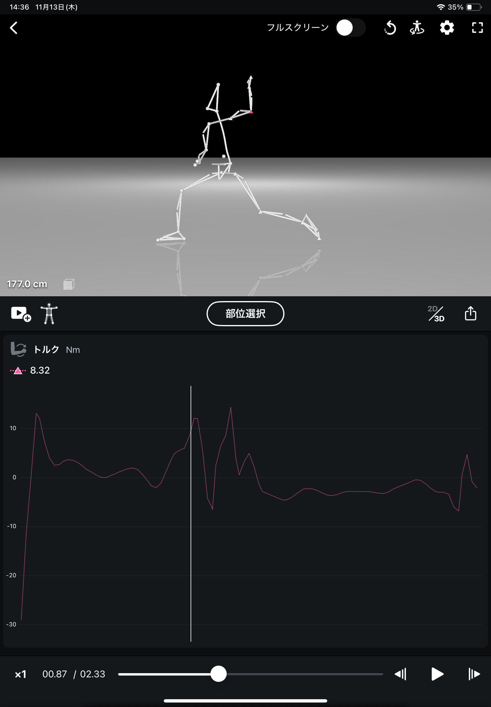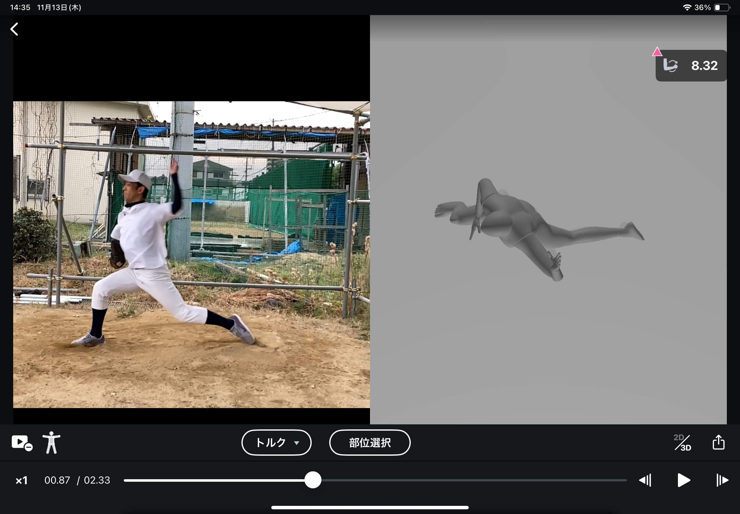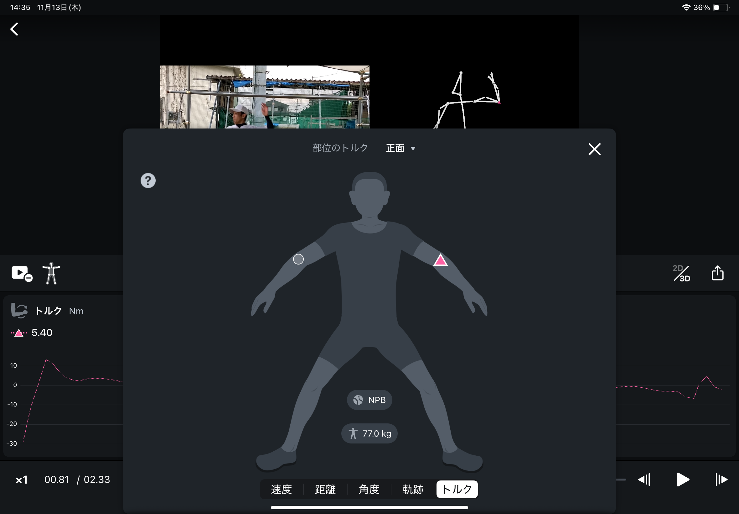 トルク(回転力)のグラフ表示機能により、動画から解析された右肘と左肘のトルクをグラフで視覚的に確認できます。