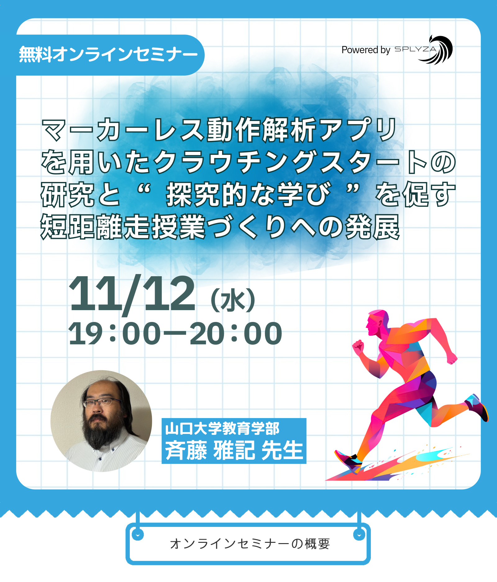 斉藤先生は、20年以上にわたり短距離走、特にクラウチングスタートに関する研究に従事されています。本ウェビナーでは、中学校短距離走の体育授業を対象に斉藤先生が取り組まれてきた、クラウチングスタート時の動作に着目した研究の内容を紹介いただきます。また、日頃の研究活動や、生徒・学生の深い学びを実現する授業づくりにおいて、AIによるマーカーレス動作解析アプリ「SPLYZA