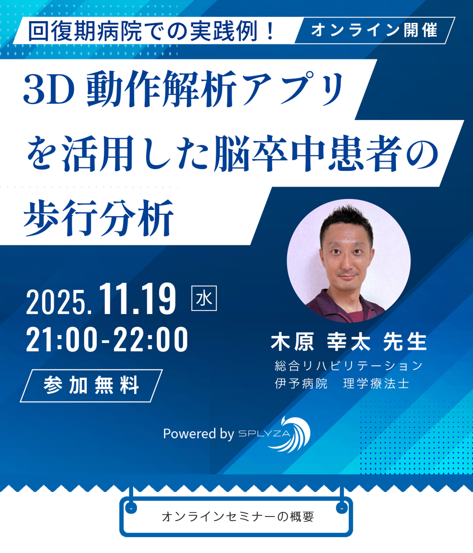本ウェビナーでは、木原先生の専門分野のご紹介と、総合リハビリテーション伊予病院における3D動作解析アプリ「SPLYZA Motion」の具体的な利用シーンや今後の活用の可能性についてお話しいただきます。