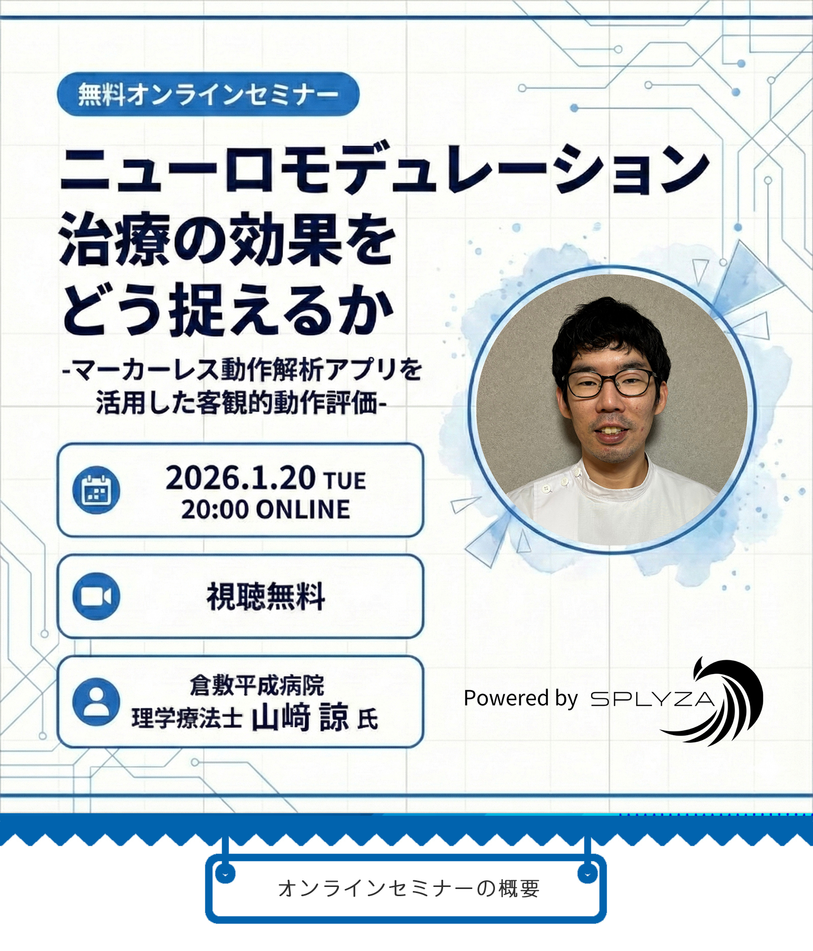 Motion」を用いた動作の質の評価や、同氏が携わっている吉備国際大学とSPLYZAとの共同研究の内容など、臨床と研究の両面から知見を共有いただきます。