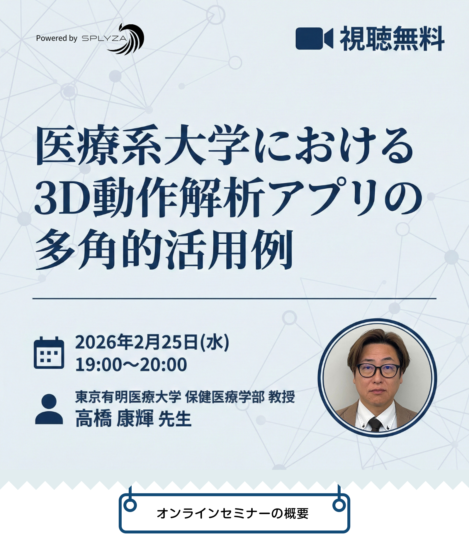 先生が出演するウェビナーを開催。髙橋先生は、治療家やトレーナーの現場において、熟練者の「感覚」や「経験則」に依存していた評価を、AIを用いて「客観化」することが重要と考えています。将来、現場に出る学生たちがAIツールを当たり前に使いこなし、患者様やクライアントに対して視覚的・定量的なフィードバックができるよう、運動学の授業等で3D動作解析アプリ「SPLYZA